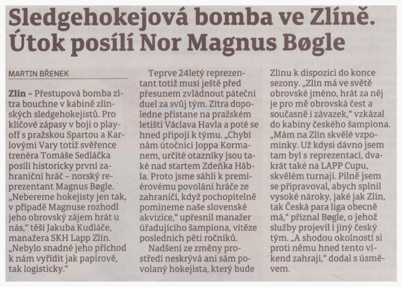 Sledgehokejová bomba ve Zlíně. Útok posílí Nor Magnus Bøgle